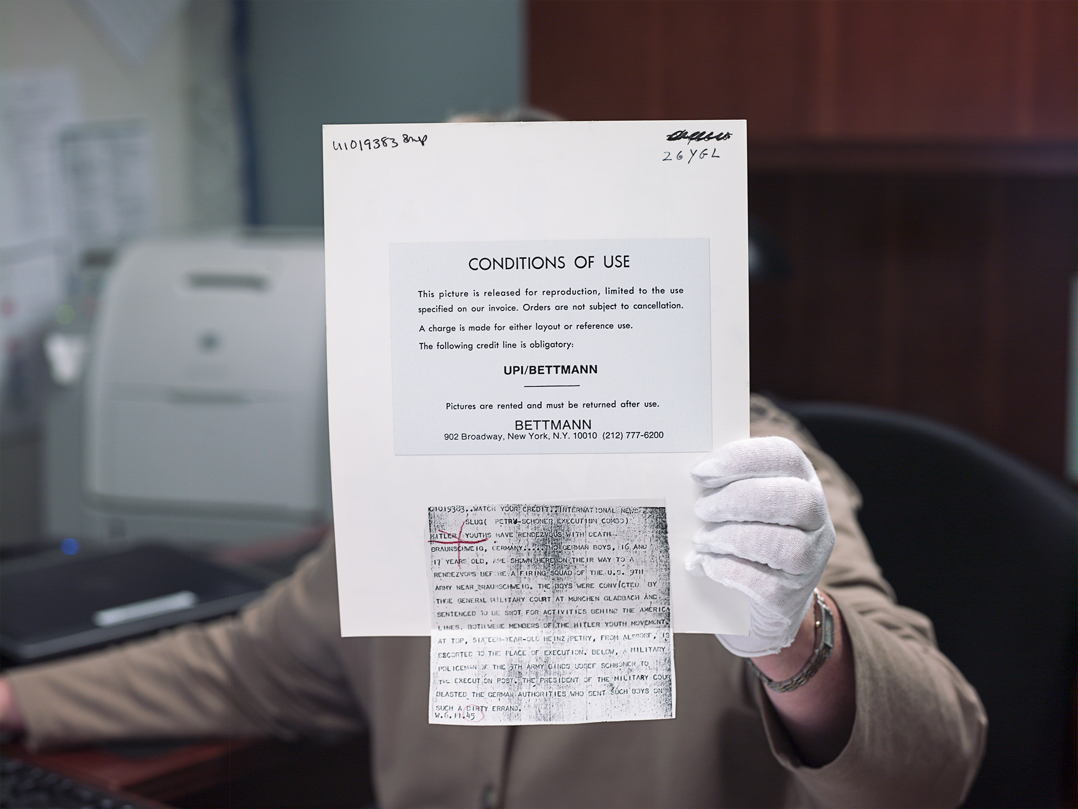 Hitler Youths have rendezous with death. Braunschweig, Germany… Two german boys, 16 and 17 years old, are shown here on their way to a rendezous before a firing squad before the U.S. 9th army near Braunshweig. The boys were convicted by the general military court at Munchen Gladbach and sentenced to be shot for activities behind the America lines. Both were members of the Hitler Youth movement. At top sixteen year old Heinz/Petry, from Alsdorf, is escorted to the place of execution. Below, a Military policeman of the 9th army binds Joseph Schoner to the execution post. The president of the military court blasted the german authorities who sent such boys on such a dirty errand.